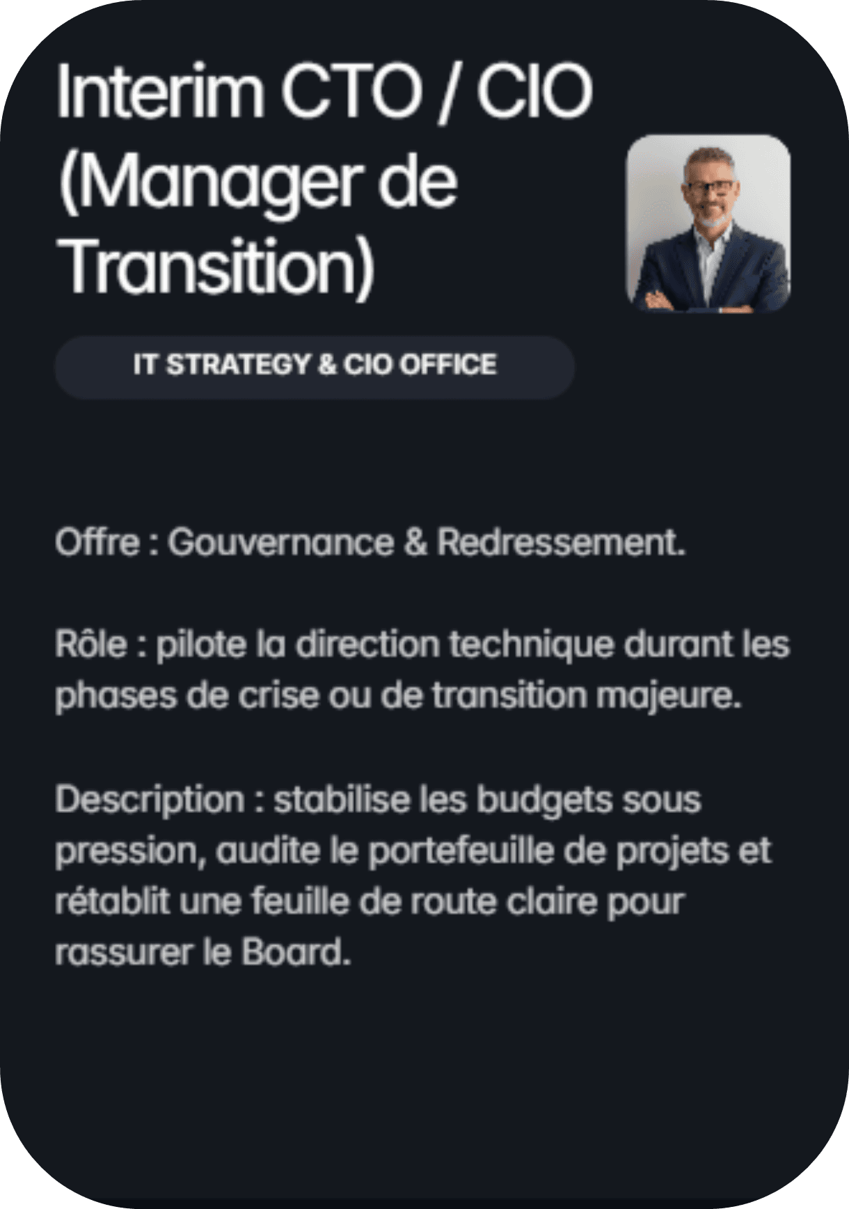Optimisation radicale du Time-to-Market et sécurisation de votre socle technologique (IA, Cloud, Cyber). Transfert de compétences stratégiques pour garantir une résilience et une souveraineté à long terme.