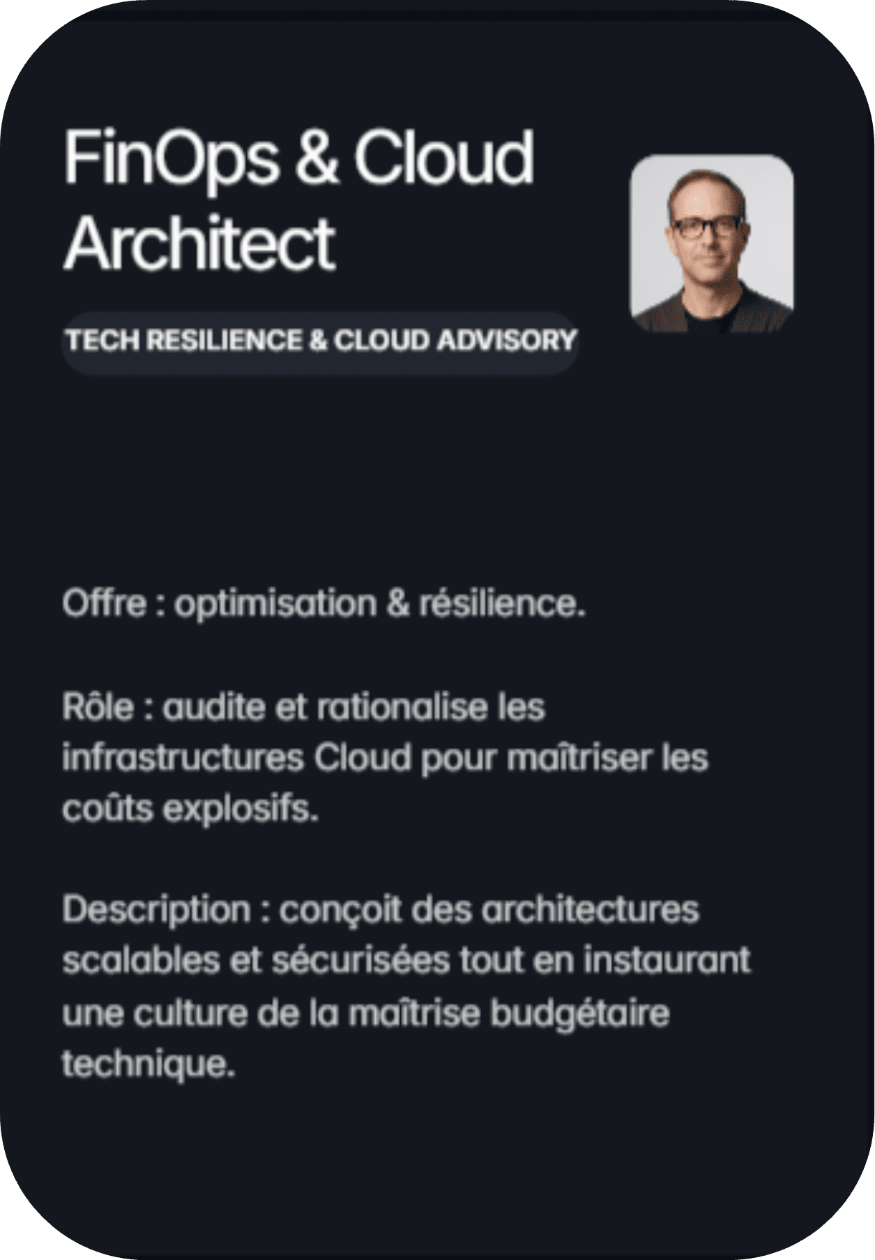 Sécurisez votre futur technologique en intégrant vos enjeux d'infrastructure dans votre pilotage de portefeuille. De l'optimisation FinOps à l'IA, nous garantissons que votre socle technique soutient vos ambitions sans dérives budgétaires.